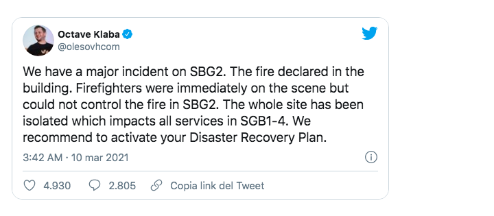 Il 10 di marzo 2021 un incendio nel data center di Strasburgo di Ovh, la società francese leader nel cloud con oltre 1,5 milioni di clienti nel mondo, ha messo offline decine di migliaia di pagine web.