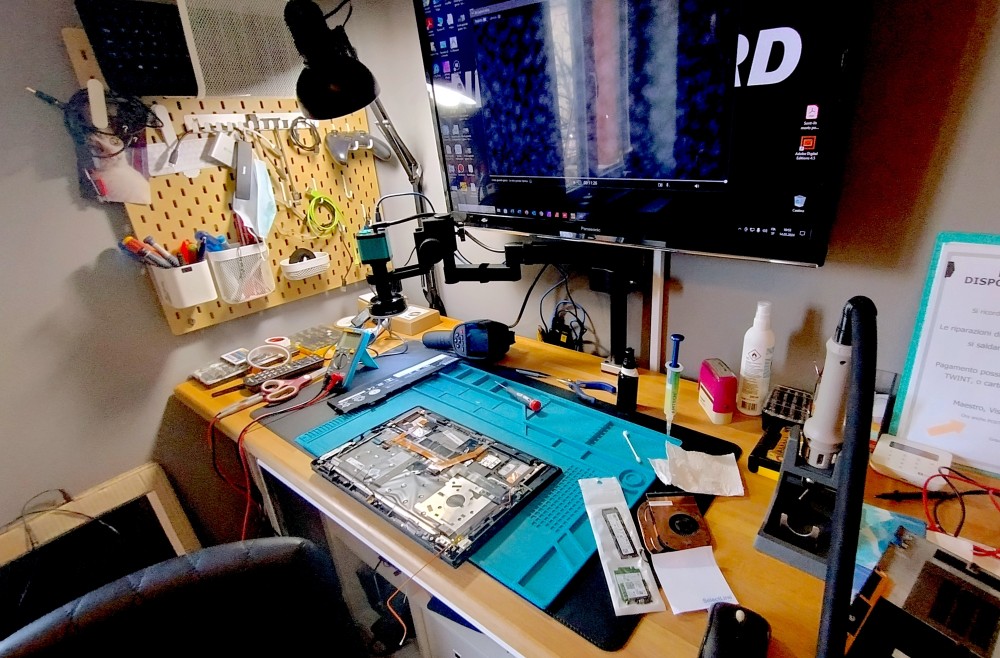 Per questo tipo di lavoro ci vogliono attrezzature particolari: microscopio, saldatori speciali con punte molto piccole e di precisione, stazione ad aria calda, ricambi, termocamera, strumenti di misurazione, schemi elettrici, eccetera.