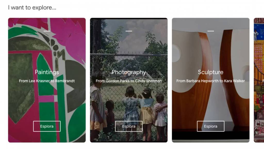 Ci troveremo davanti alla homepage di Google Arte e Cultura che ci propone subito svariate visite guidate suddivise in categorie. Scorrendo la pagina possiamo trovare la categoria "Explore" ed altre, quali visite audioguidate, video o tour virtuali. Questa home riassume parte dei contenuti aggiunti di recente o proposti da Google al momento.